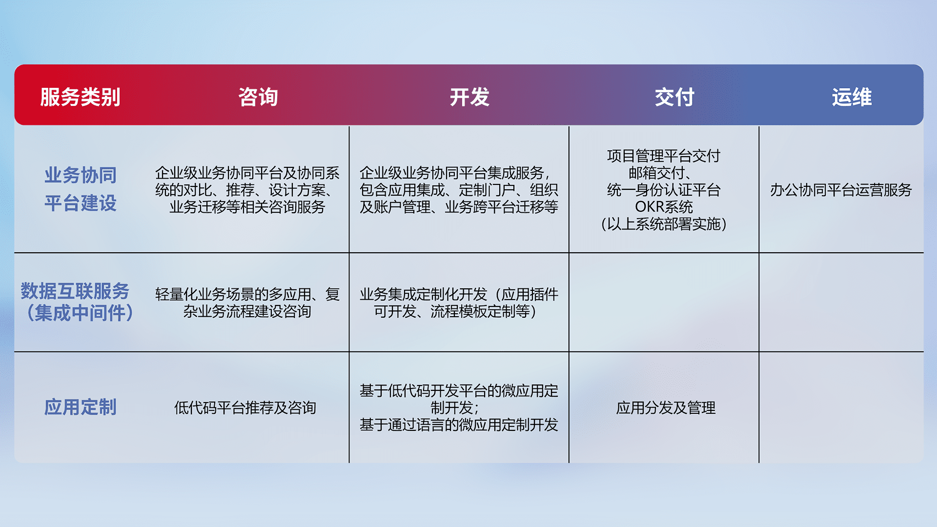 针对钉钉、、、企微、、IDaas等平台级产品提供产品的规划、、、方案、、、、交付、、、、定制化开发等服务,,,,实现如统一协同办公、、、智能客户服务、、、混合会议管理、、智能数据查询、、、等业务场景,,实现数字化转型。。
