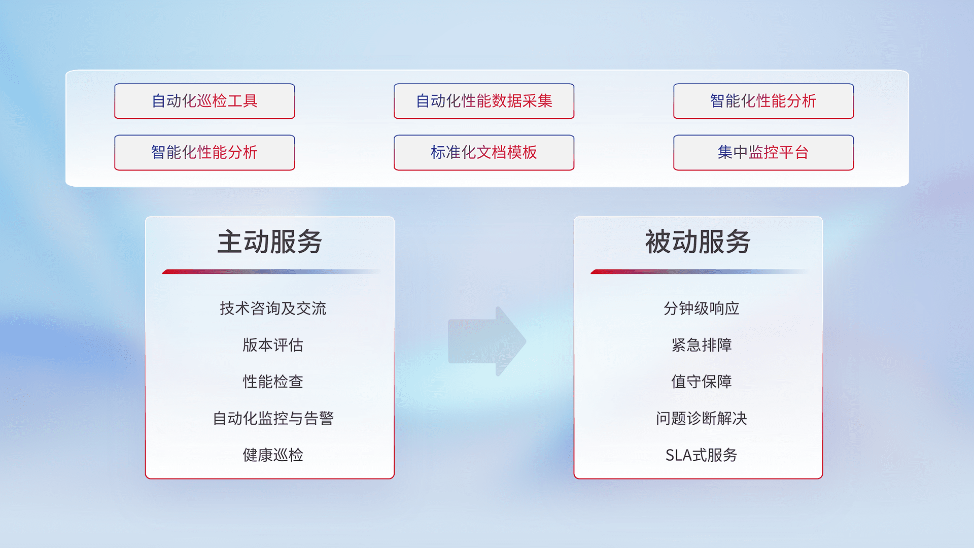 智能化工具和标准化文档,,,保障服务质量,,,,提供主动服务(包含技术咨询、、、、版本评估、、、、性能检查、、自动化监控与告警、、、、健康巡检)和被动服务包含(分钟级响应、、、紧急排障、、、、值守保障、、、、问题诊断解决、、SLA服务)。。。。